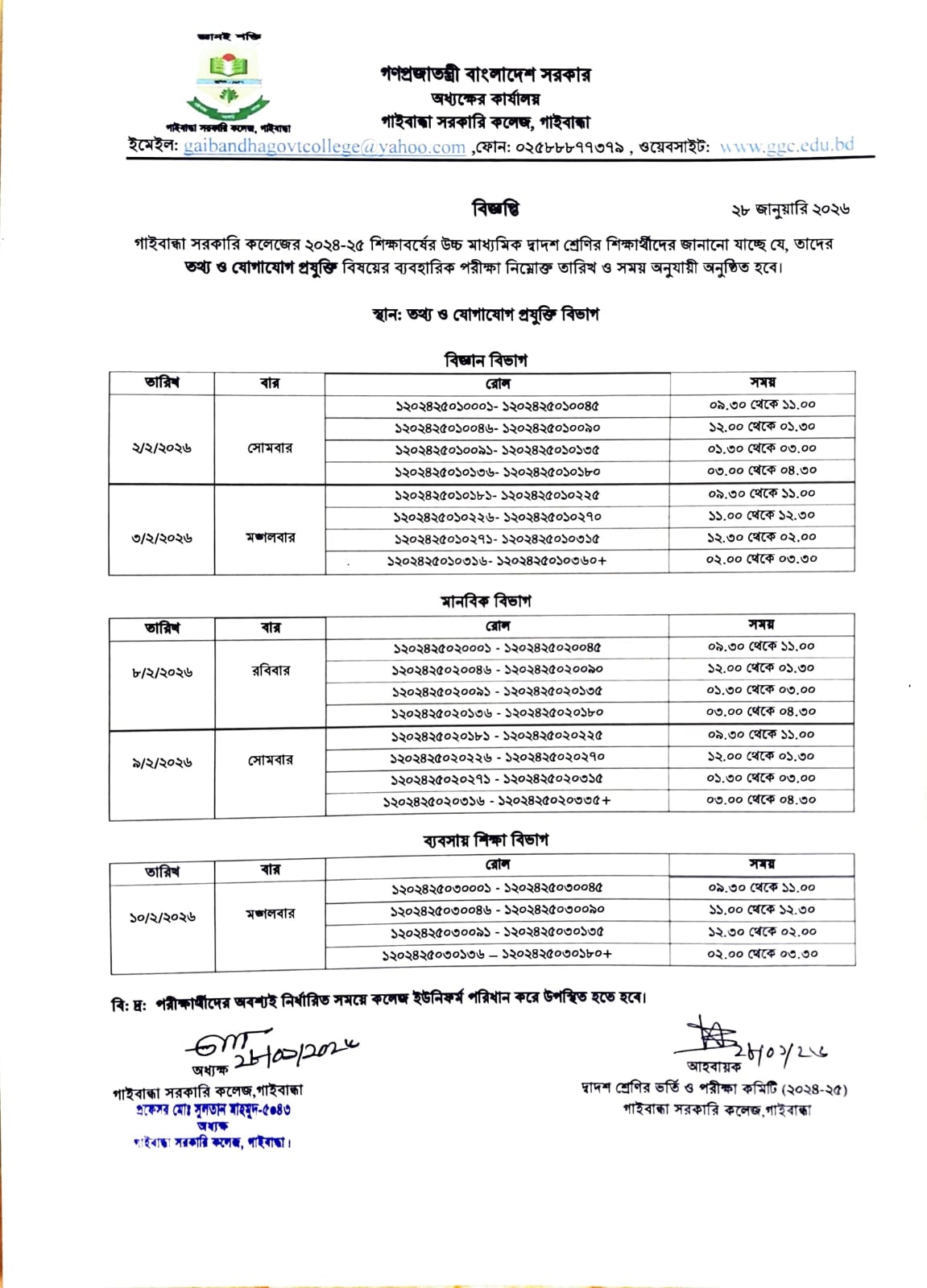গাইবান্ধা সরকারি কলেজের ২০২৪-২৫ শিক্ষাবর্ষের দ্বাদশ শ্রেণির শিক্ষার্থীদের তথ্য ও যোগাযোগ প্রযুক্তি বিষয়ের ব্যবহারিক পরীক্ষার সময়সূচী ।By Fa1sal / January 28, 2026